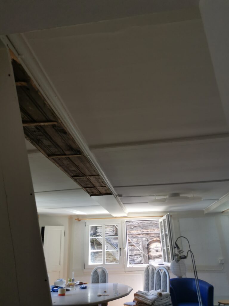 Direkt nach dem Kauf habe ich die Abdeckung vom Balken entfernt. Ich war mir sicher eine Inschrift zu finden. Und tatsächlich kam eine Inschrift hervor.