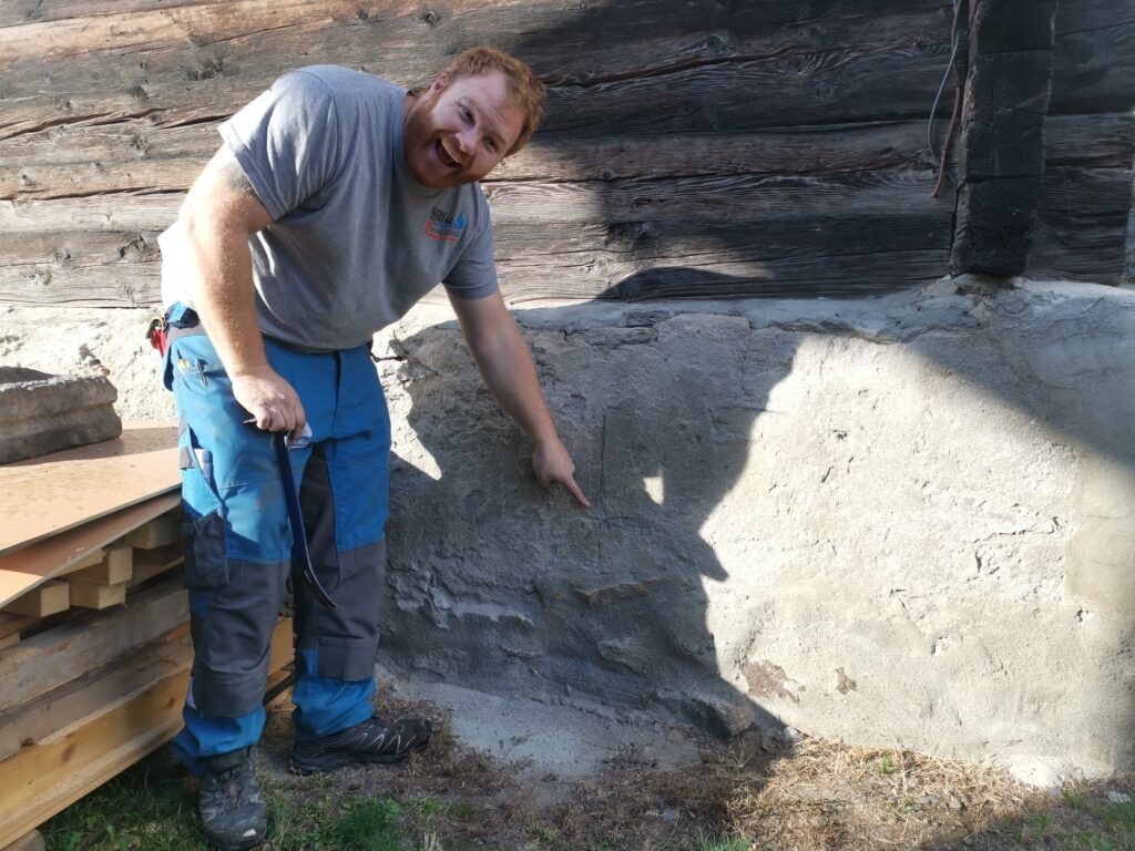 Felix, unser Heizungs- und Sanitärinstallateur, markiert die Stelle für die Luftdurchlässe der Wärmepumpe.