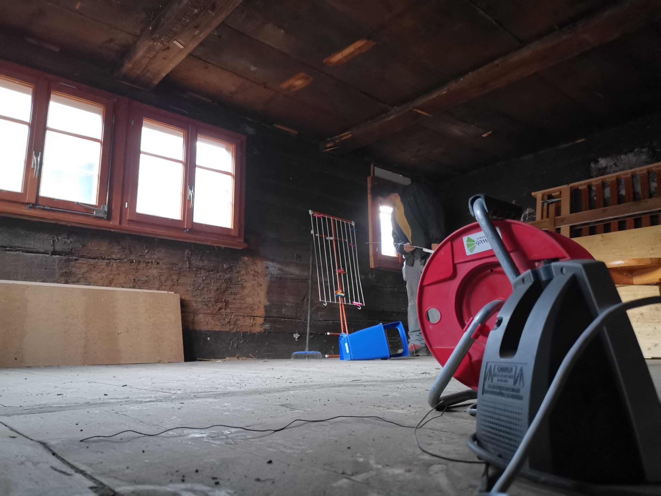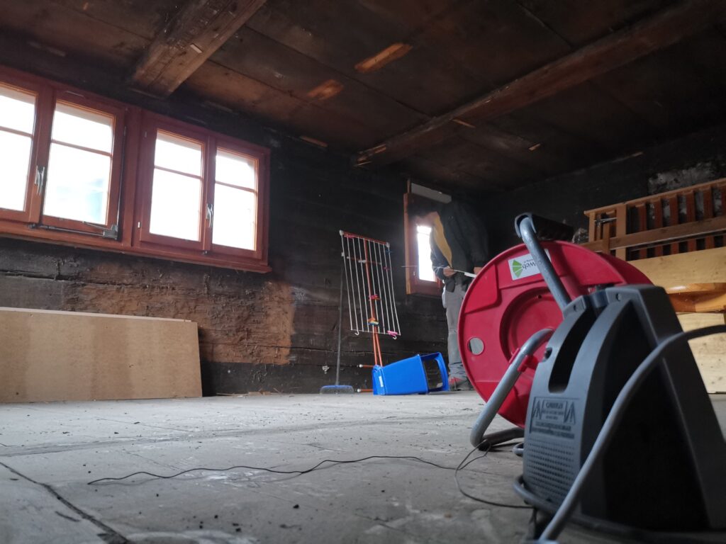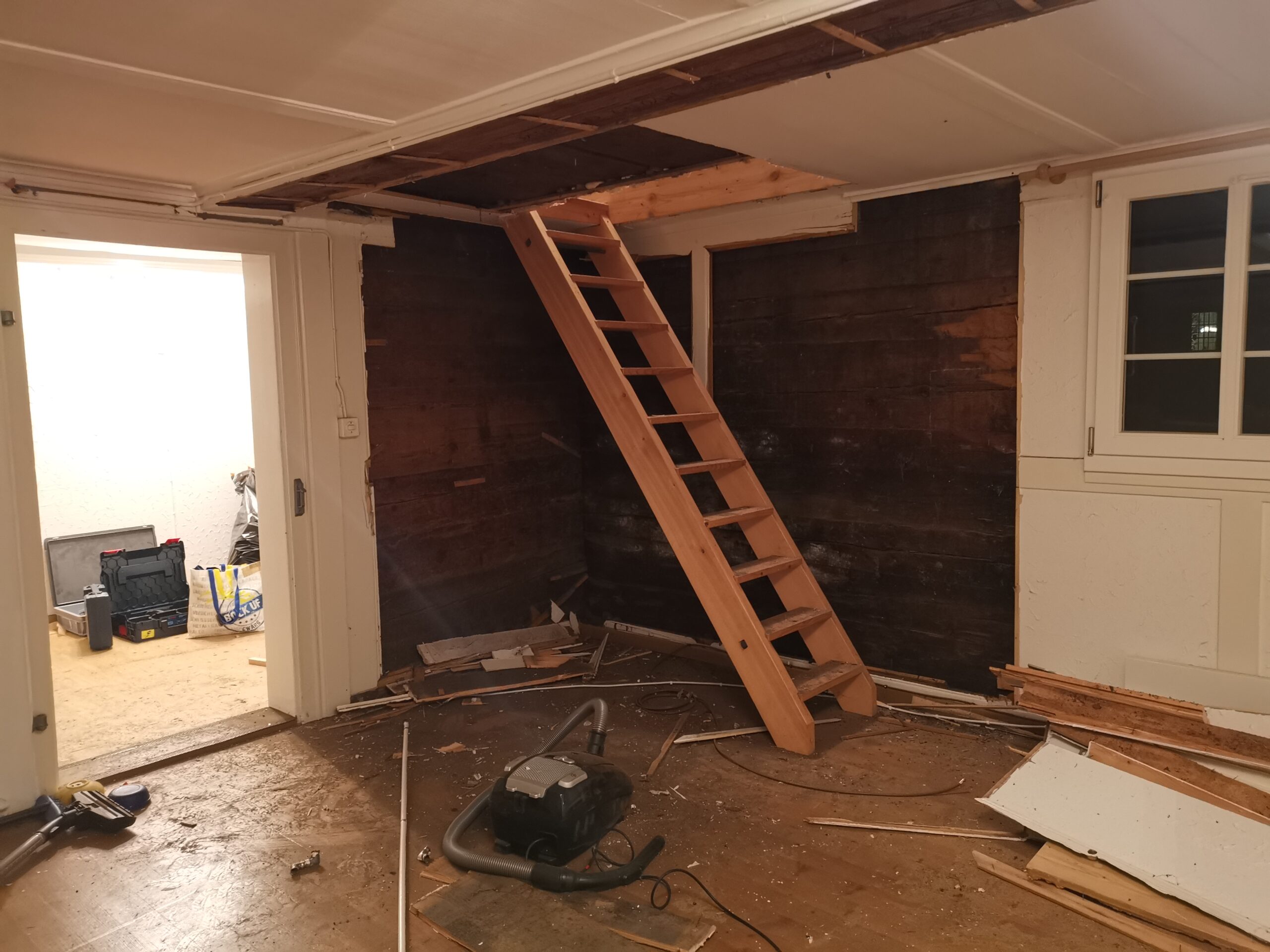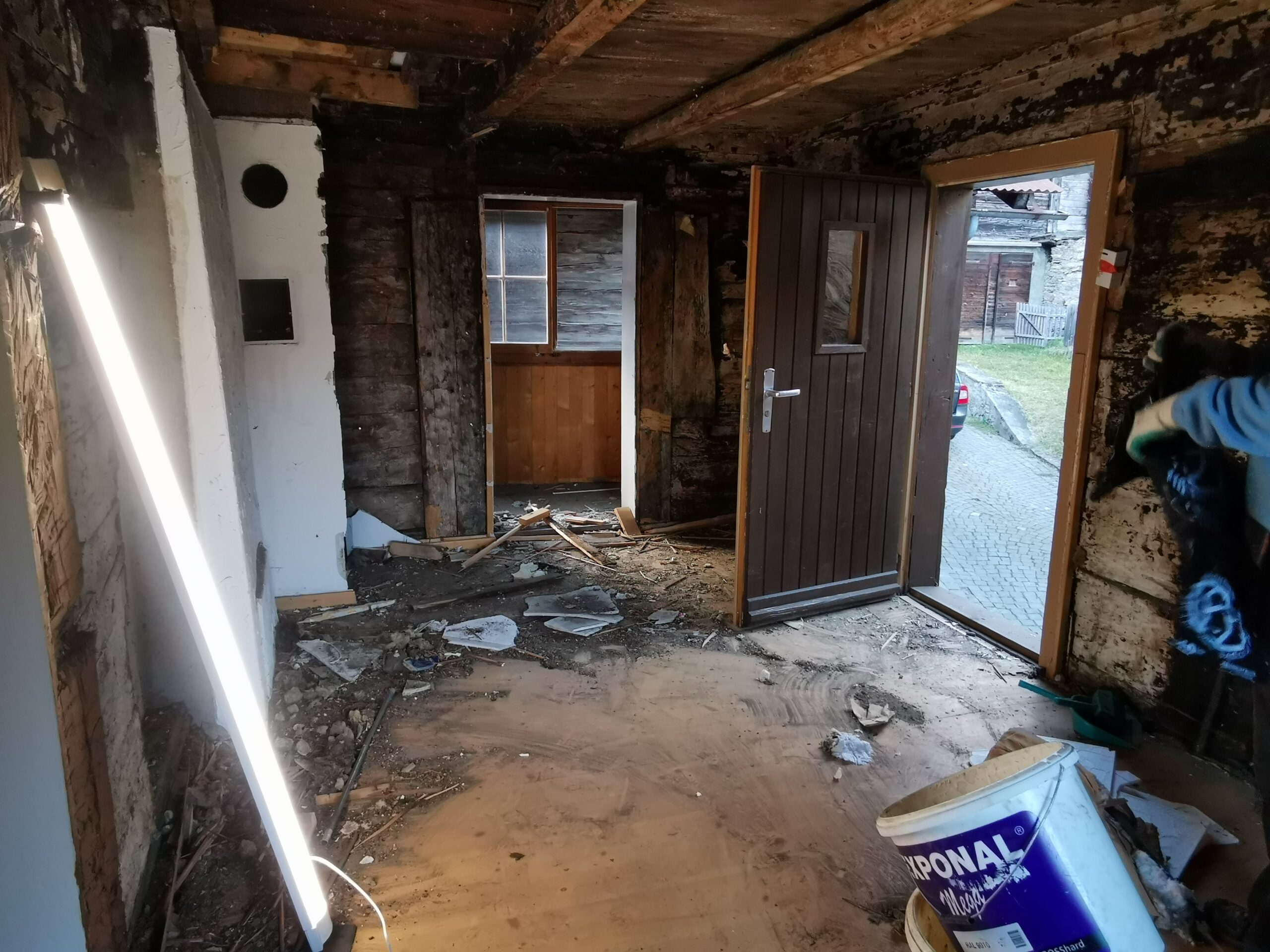 Sämtliche Innenwände welche mit viel Liebe in den 40er Jahren eingebaut wurden, haben wir nun entfernt. Warum? Ohne Isolation ist dieses Haus im Jahre 2020 nicht mehr bewohnbar. Aktuell ist das Haus unbeheizt. Das heisst es ist im inneren des Hauses kälter als draussen. Die Heizkosten würden ins unermessliche gehen.