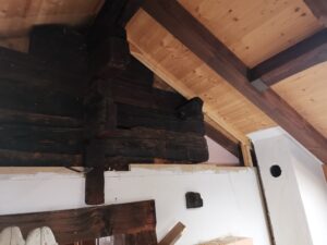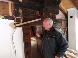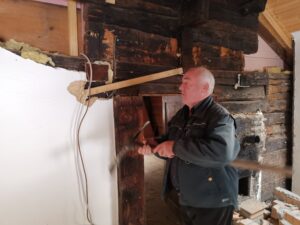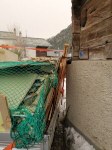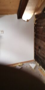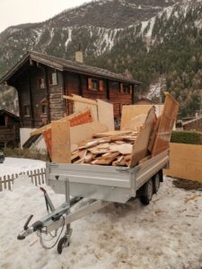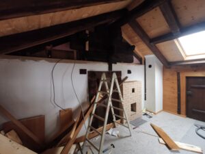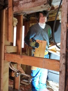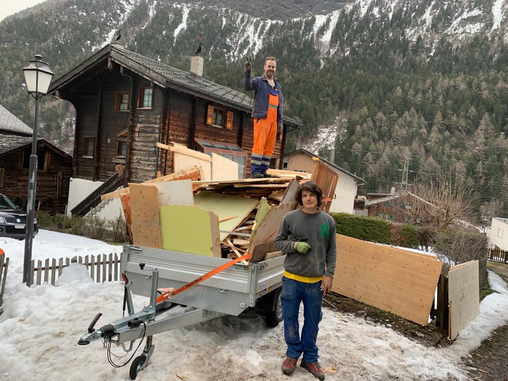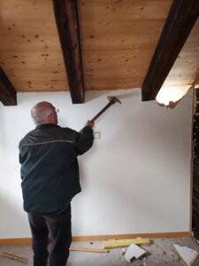 Pius und Tobi machten sich hinter das Badezimmer, wobei sie viel Frust hatten beim Ausriss weil alles voll mit Novilon war. Die Spanplatten komplett beklebt und in den Wänden eingespannt.
