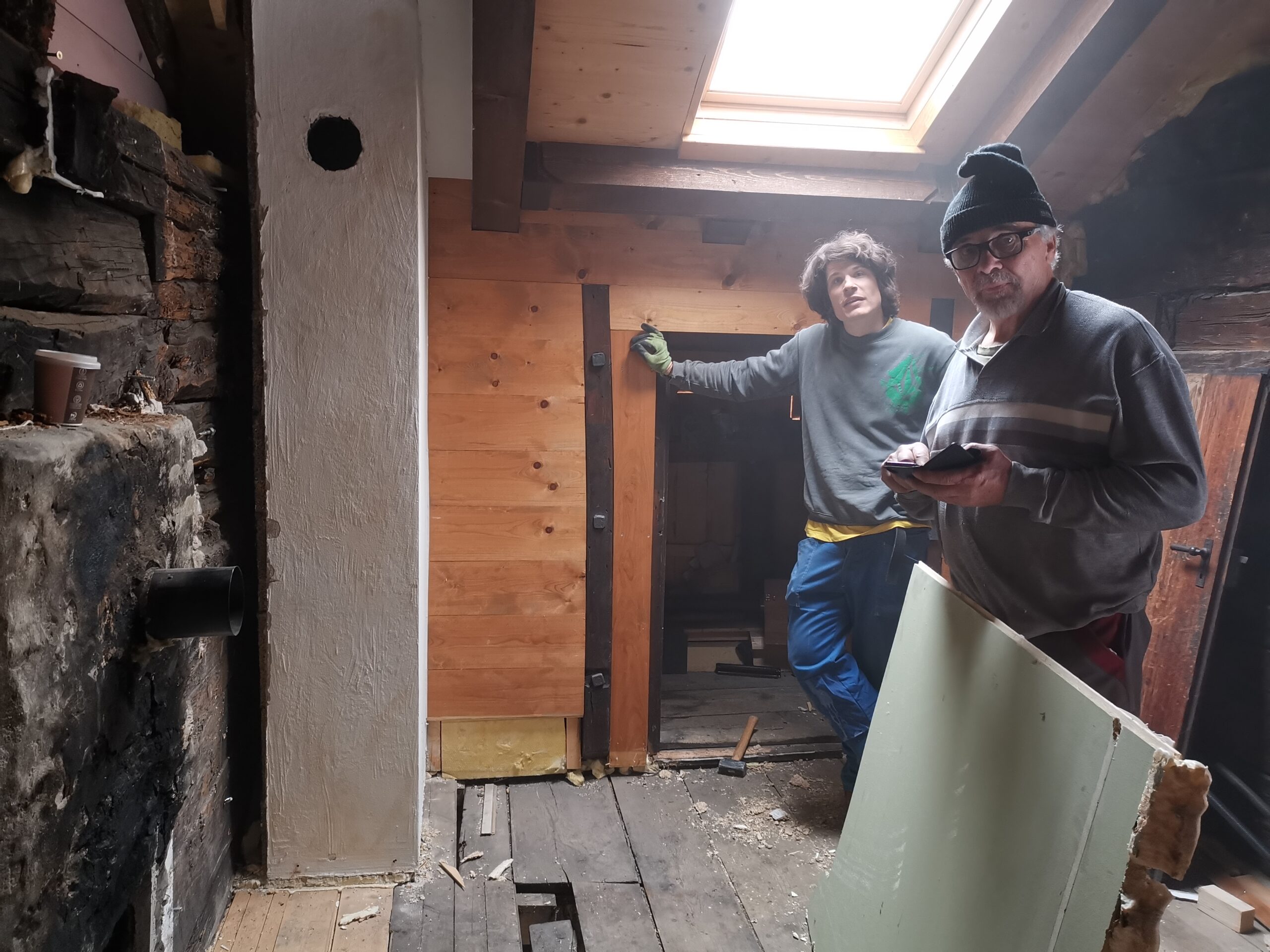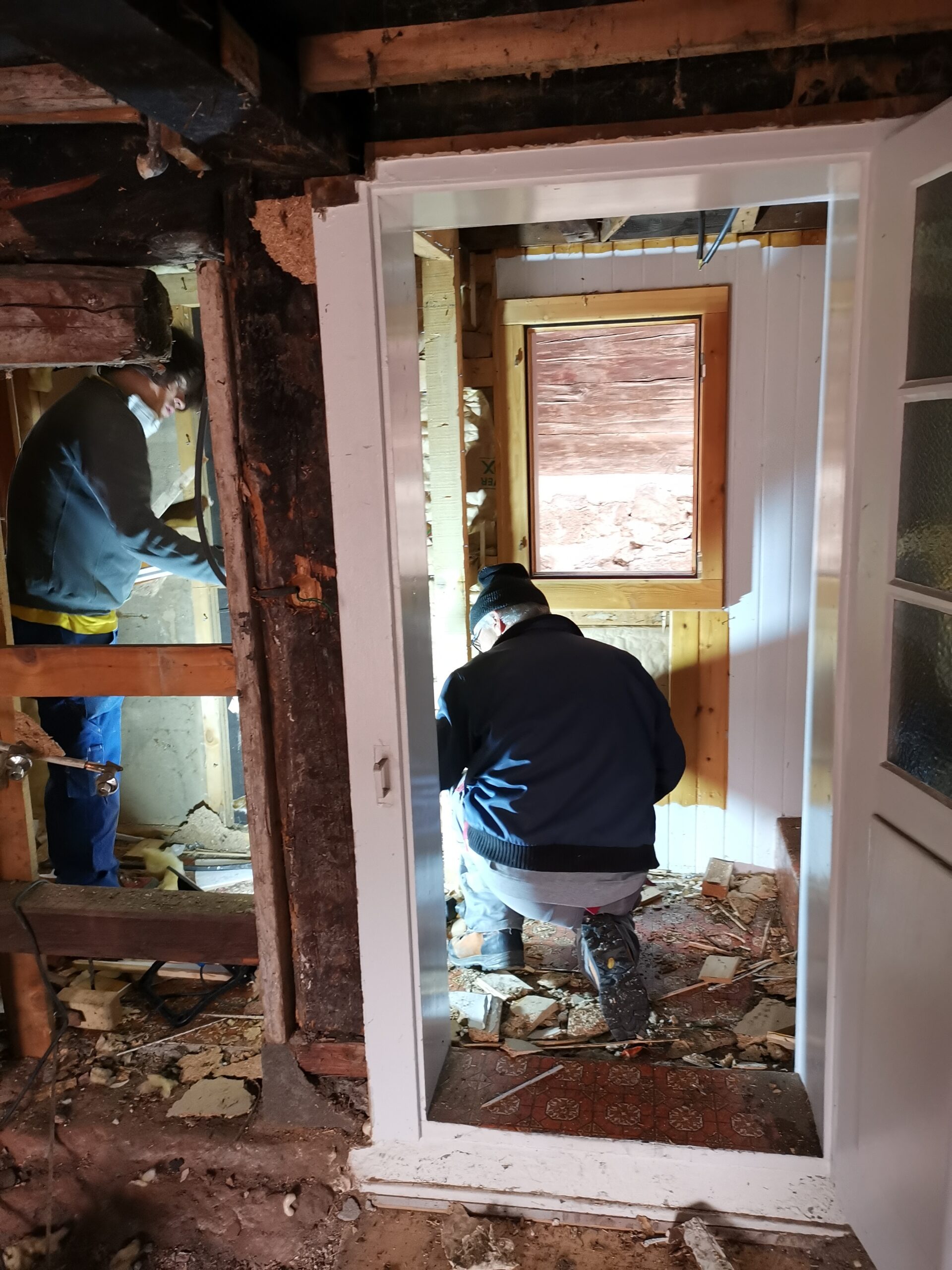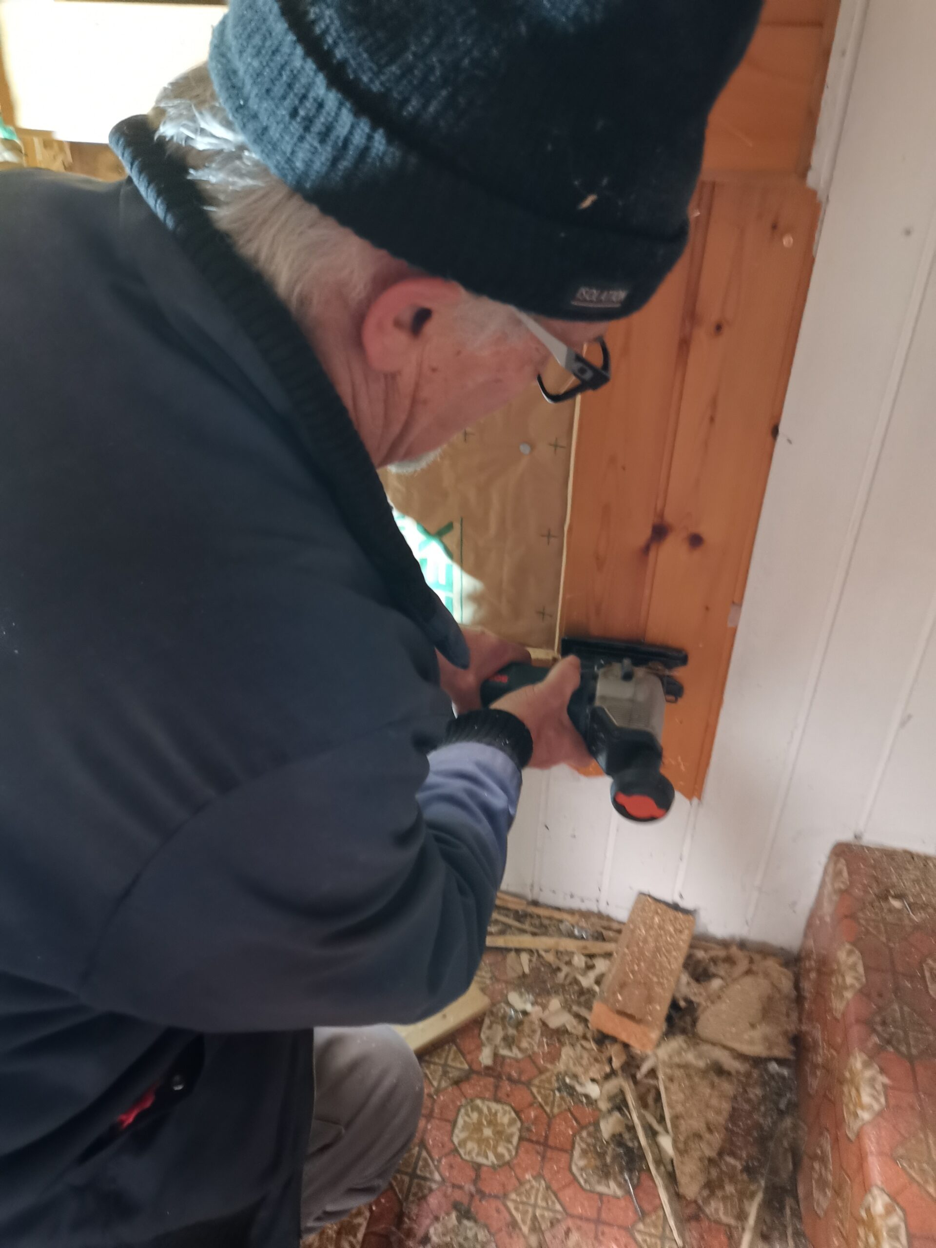 Pius und Tobi machten sich hinter das Badezimmer, wobei sie viel Frust hatten beim Ausriss weil alles voll mit Novilon war. Die Spanplatten komplett beklebt und in den Wänden eingespannt.