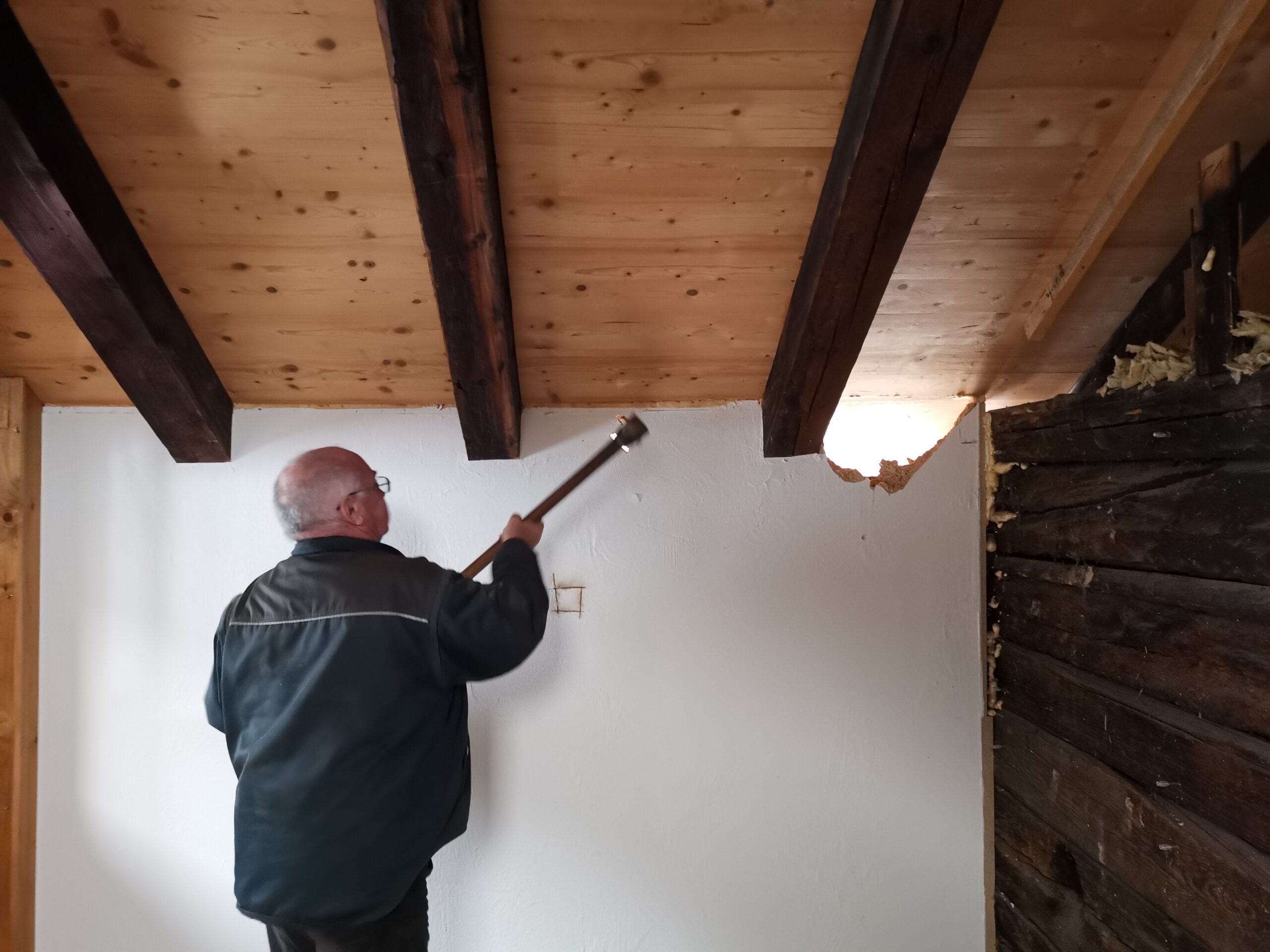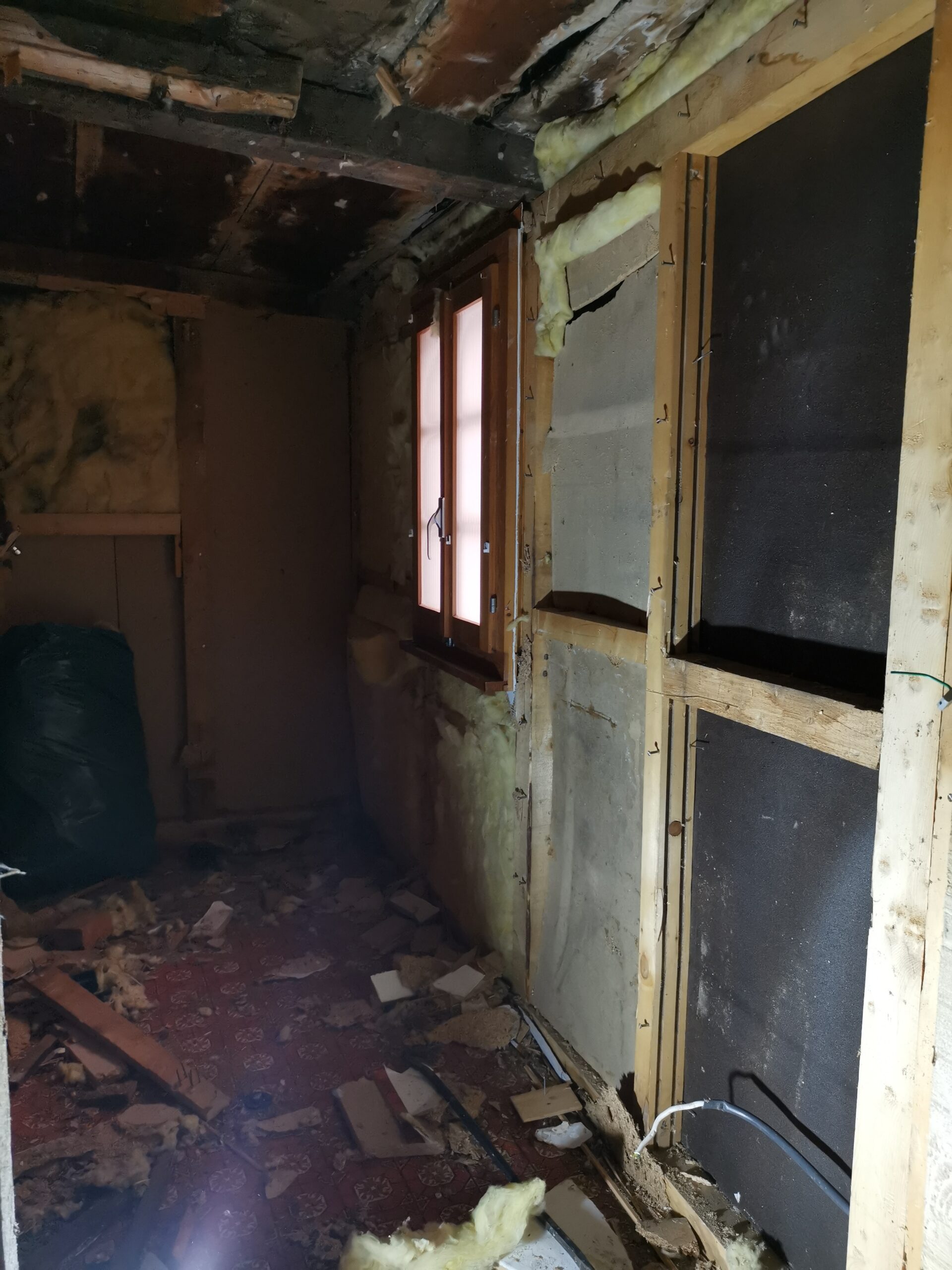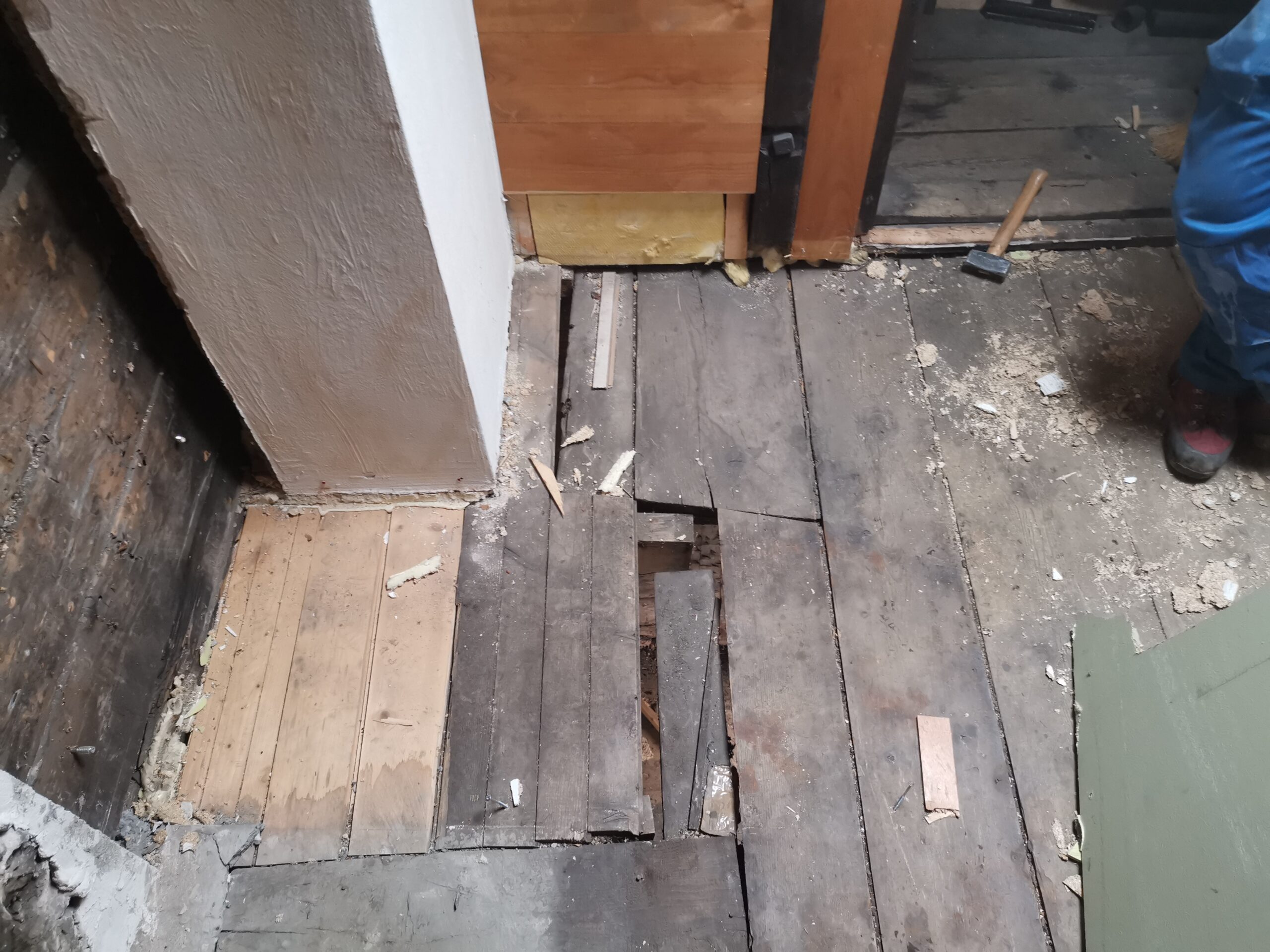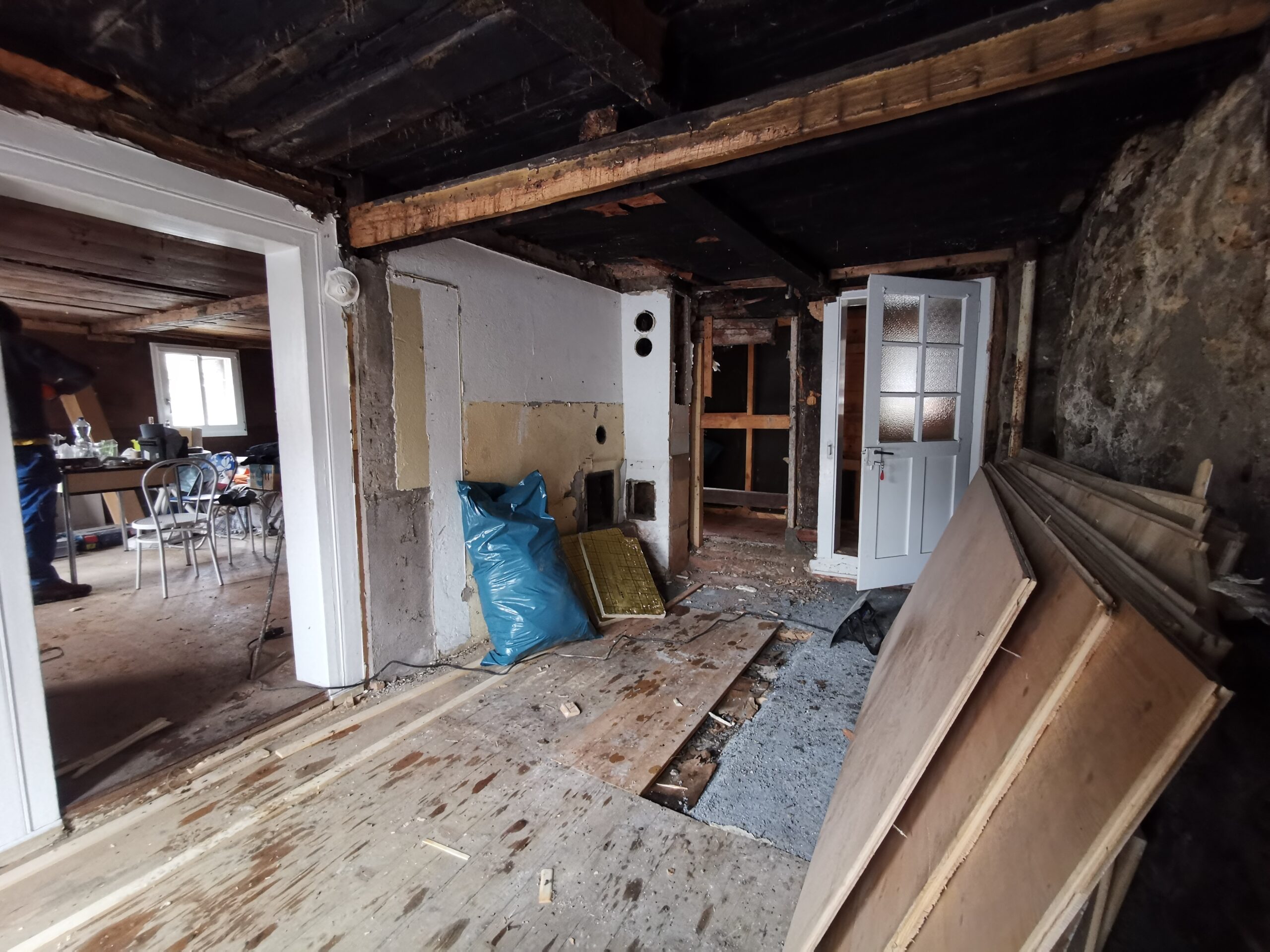 Pius und Tobi machten sich hinter das Badezimmer, wobei sie viel Frust hatten beim Ausriss weil alles voll mit Novilon war. Die Spanplatten komplett beklebt und in den Wänden eingespannt.