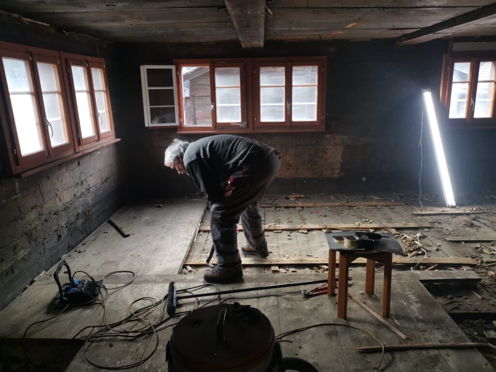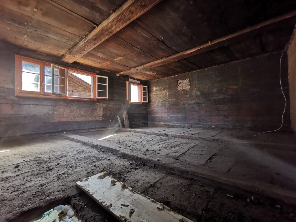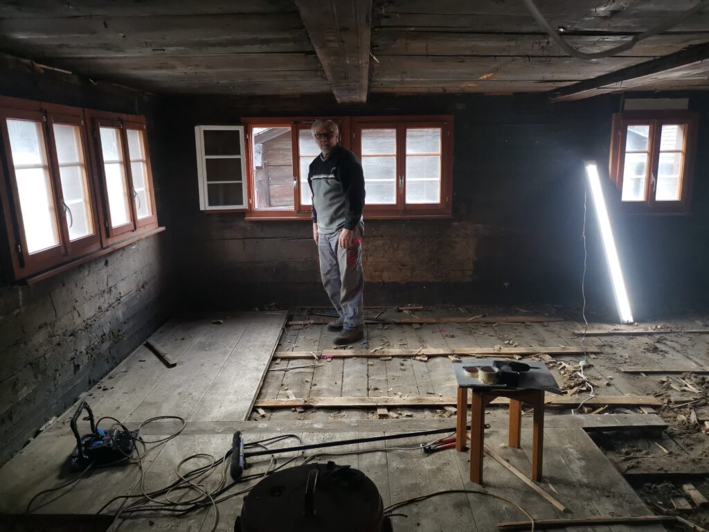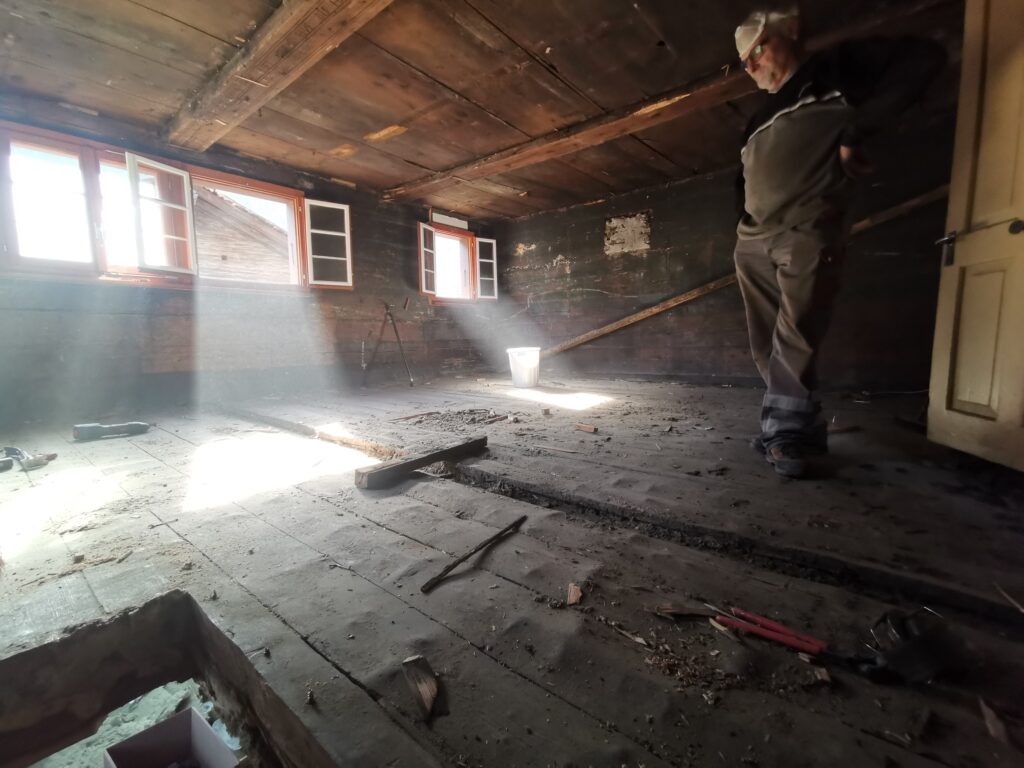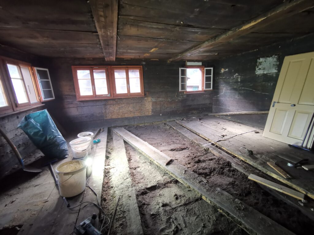 Unter dem fertigen Boden war eine durchgehende verdübelte Balkenlage. Zwischen dieser Balkenlage und der darunterliegenden Diele war mindestens 1m3 Dreck.