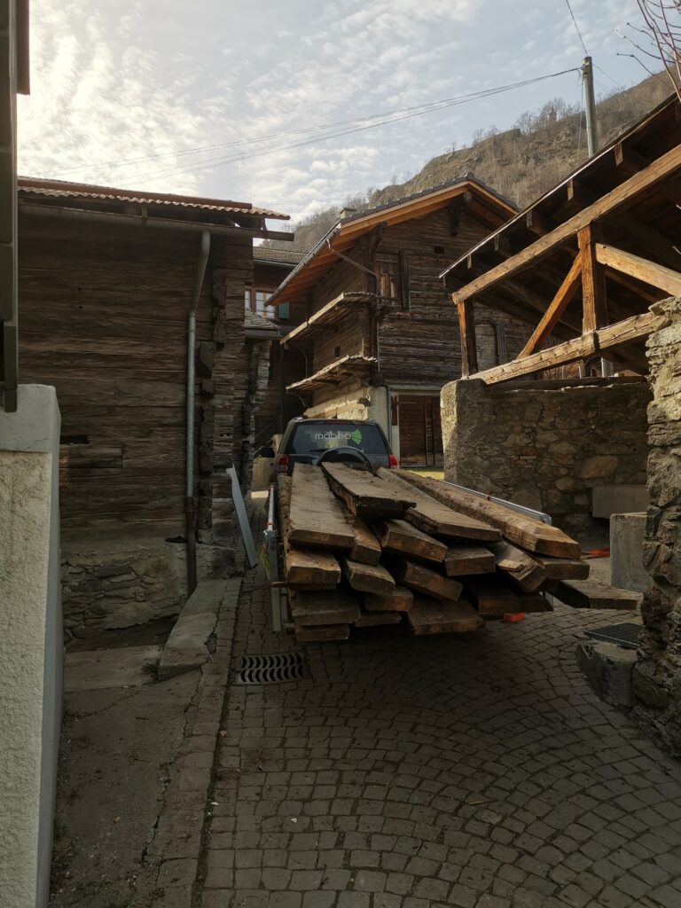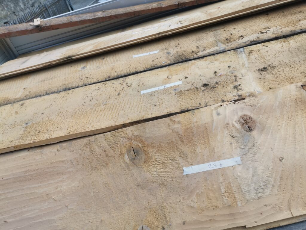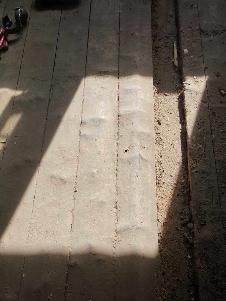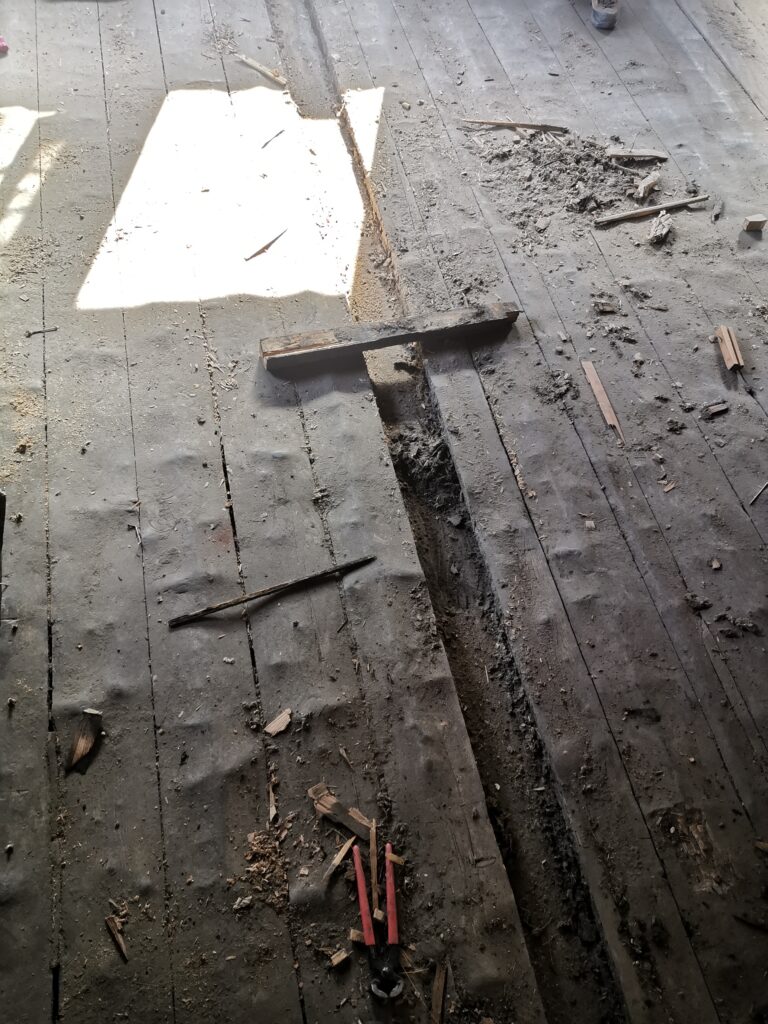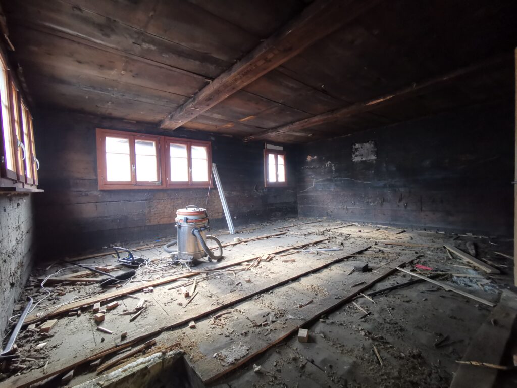 Unter dem fertigen Boden war eine durchgehende verdübelte Balkenlage. Zwischen dieser Balkenlage und der darunterliegenden Diele war mindestens 1m3 Dreck.