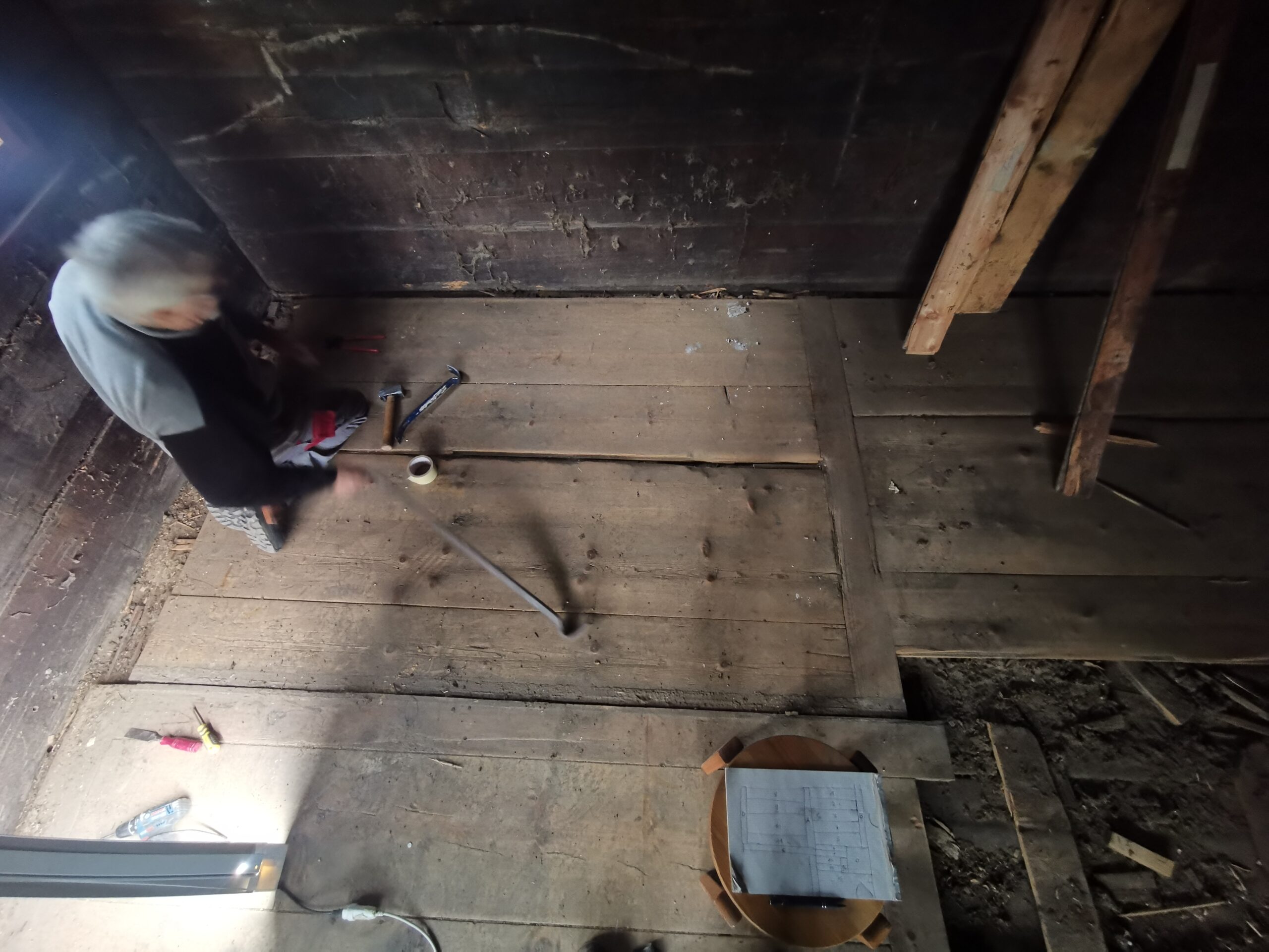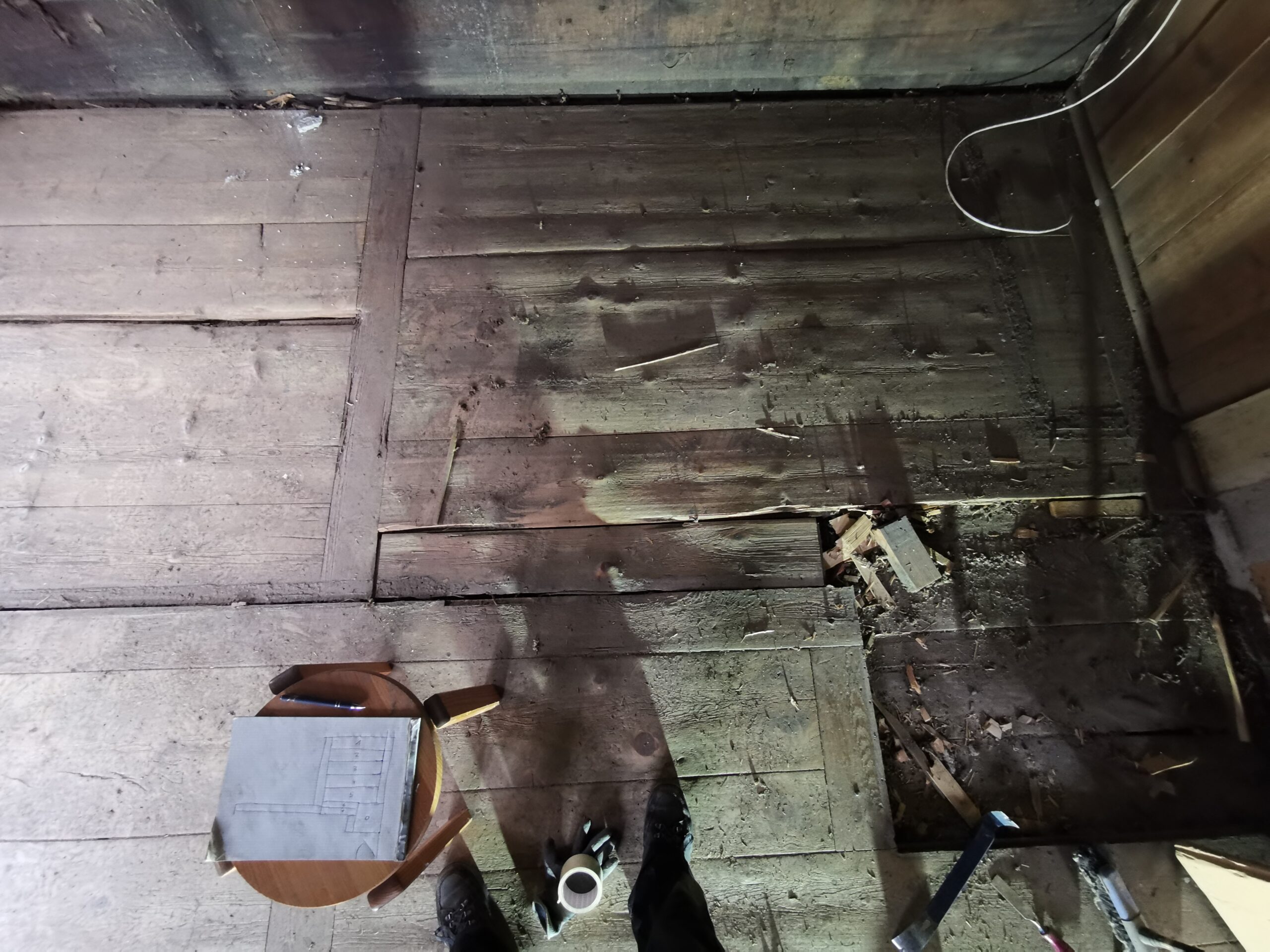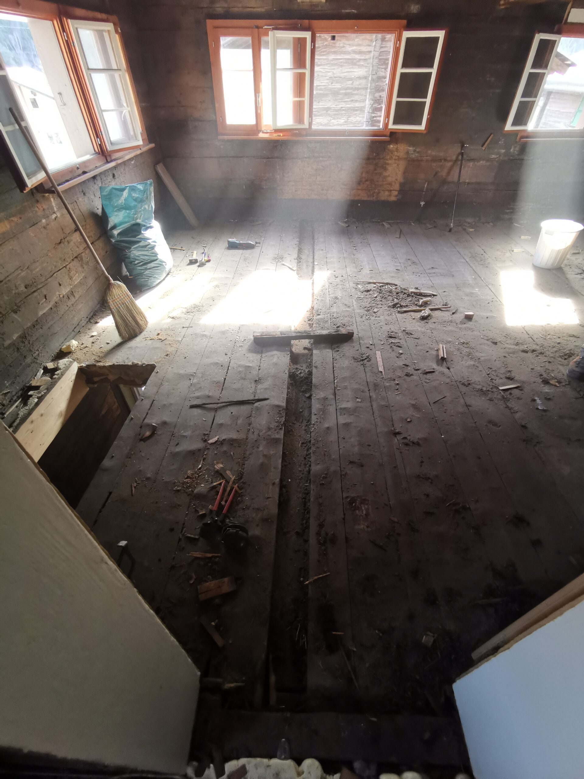 Unter dem fertigen Boden war eine durchgehende verdübelte Balkenlage. Zwischen dieser Balkenlage und der darunterliegenden Diele war mindestens 1m3 Dreck.