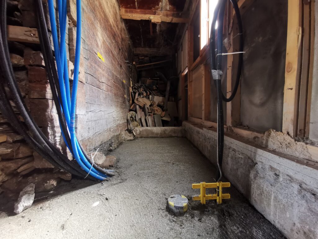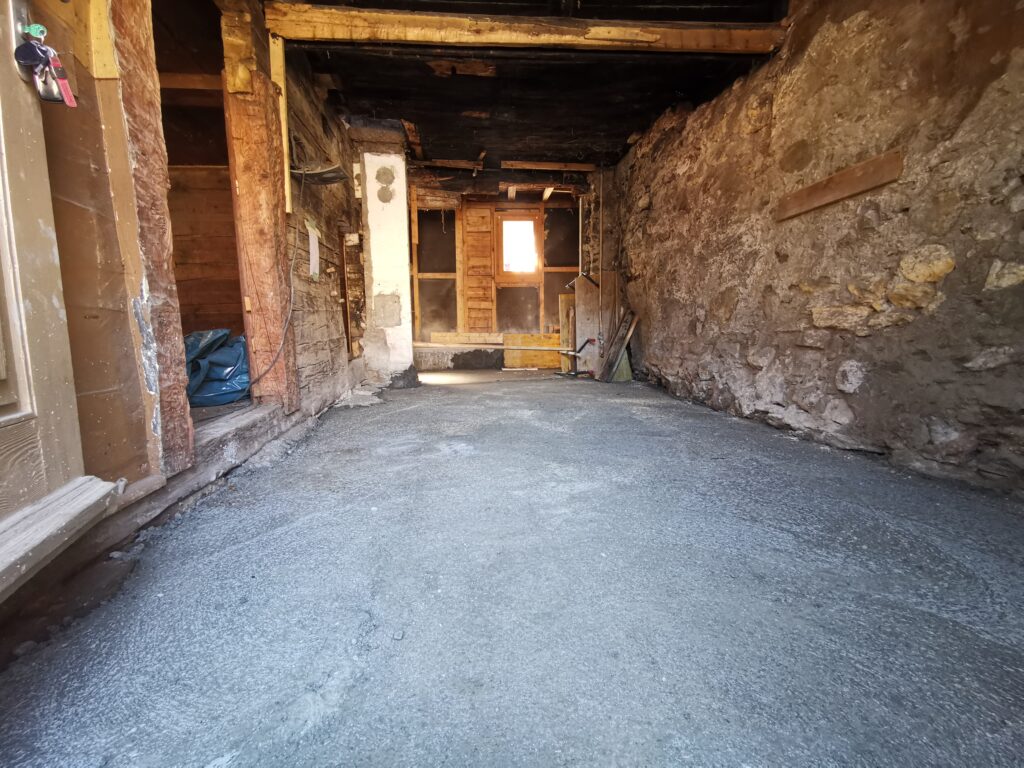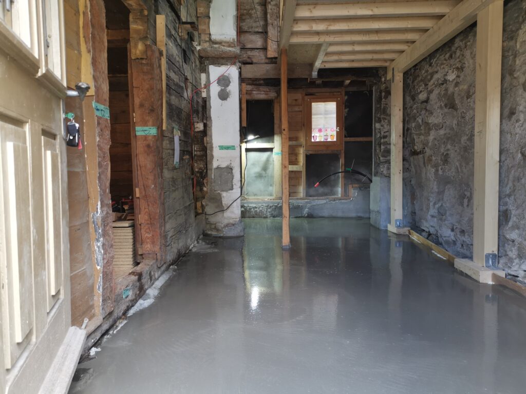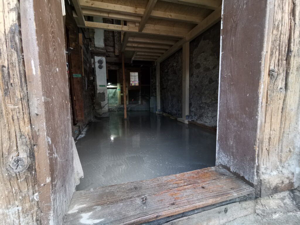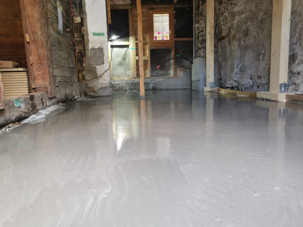Der Betonboden ist für die Isolationsschicht nicht geeignet, es hat zu viele Höhendifferenzen. Deshalb habe ich den Boden mit SIKA-Floor Level 340 ausgegossen.