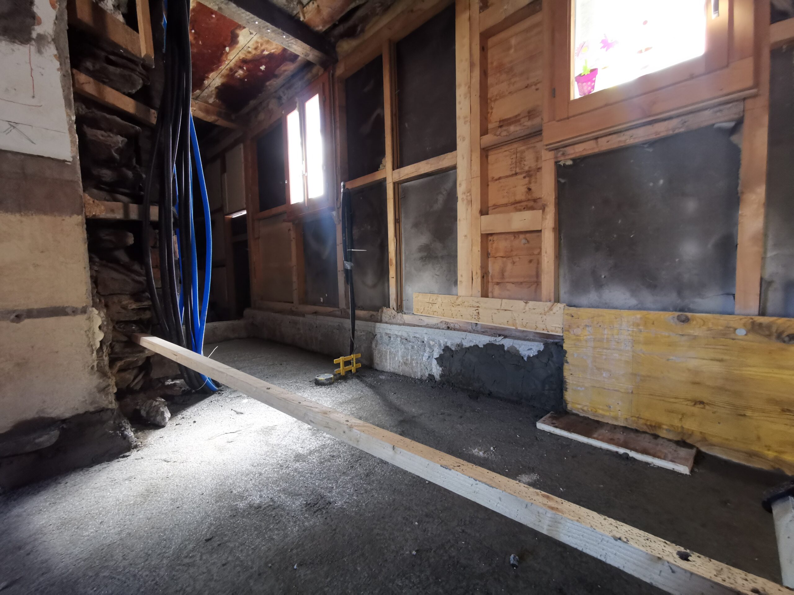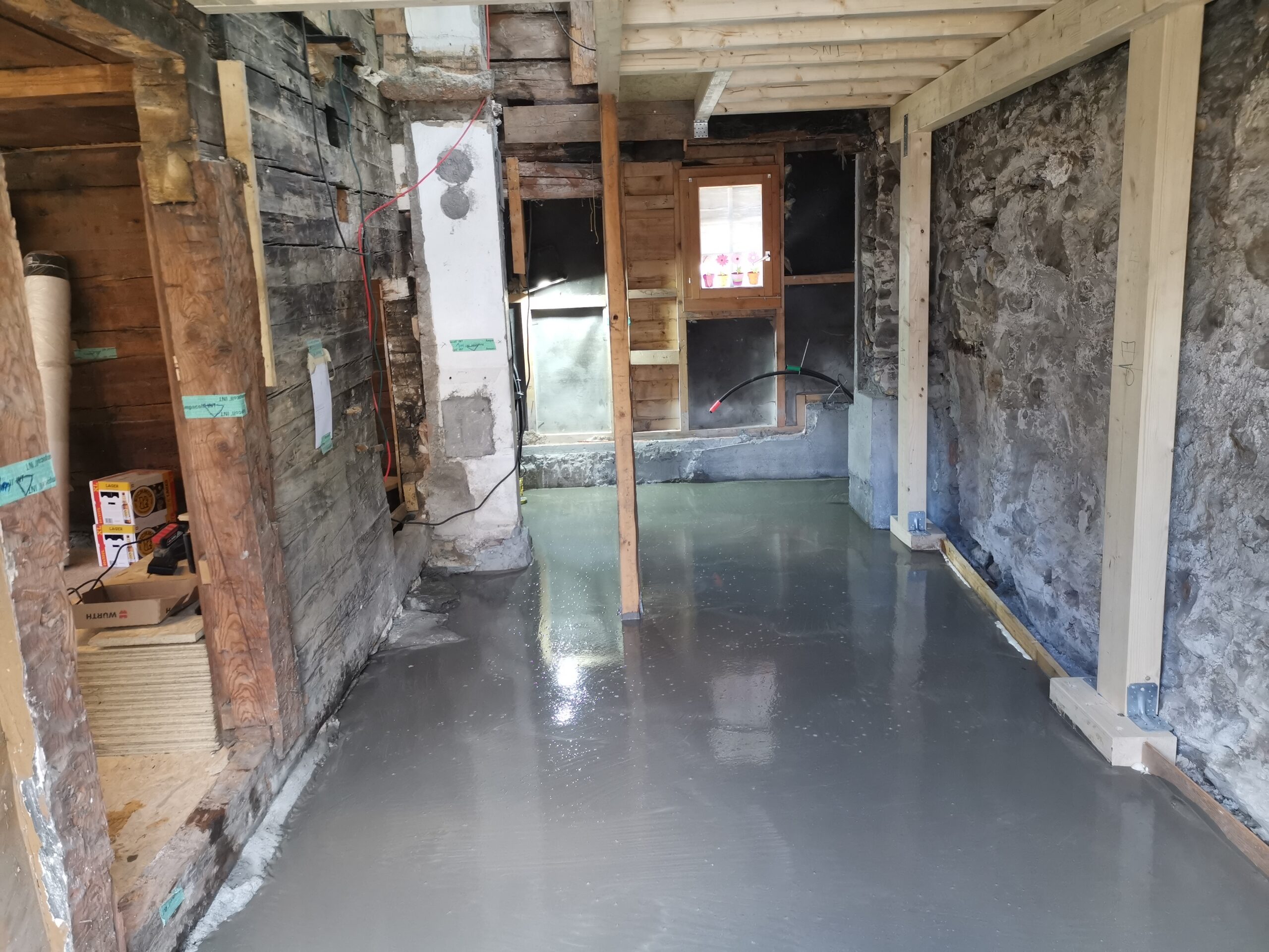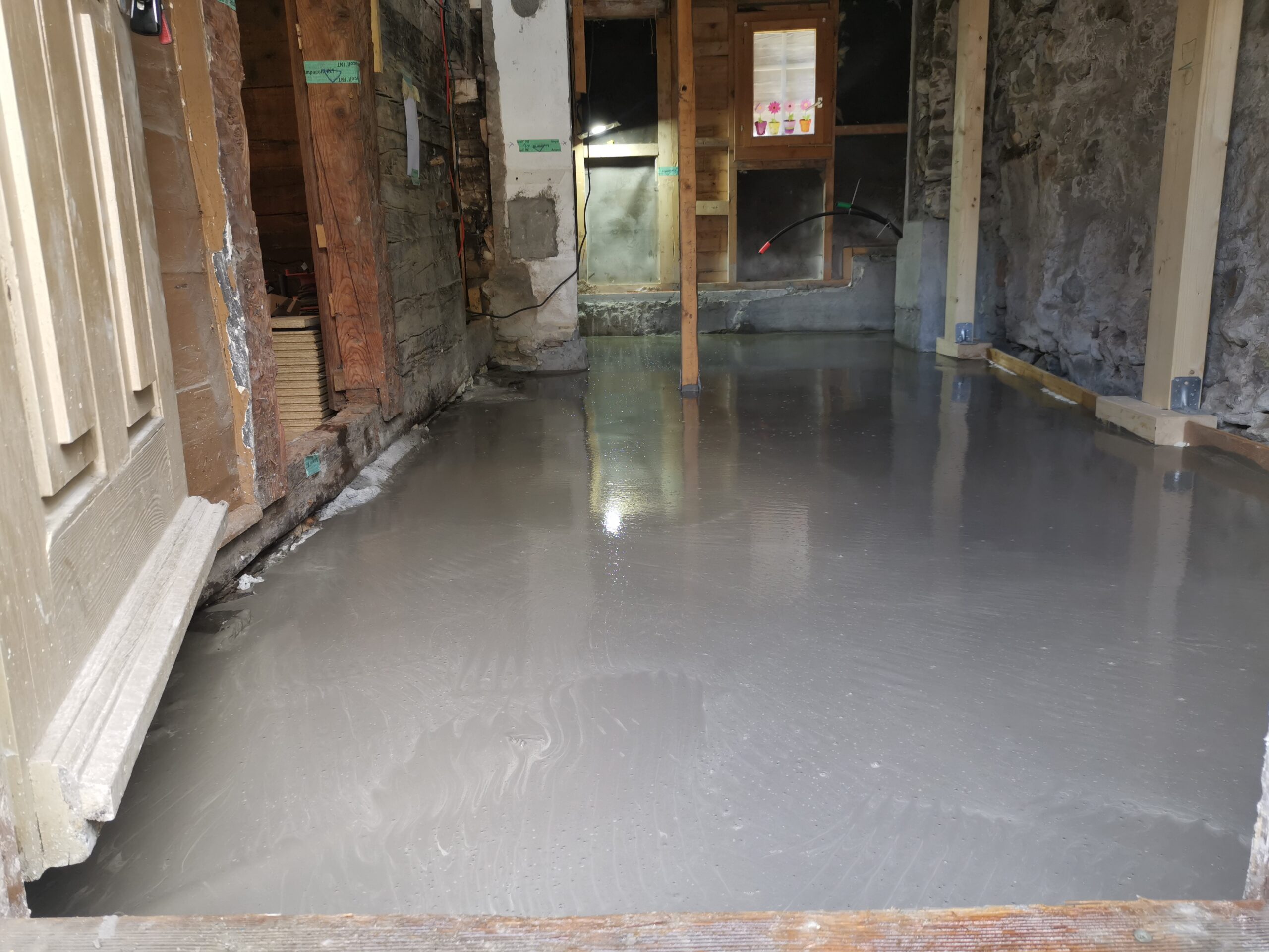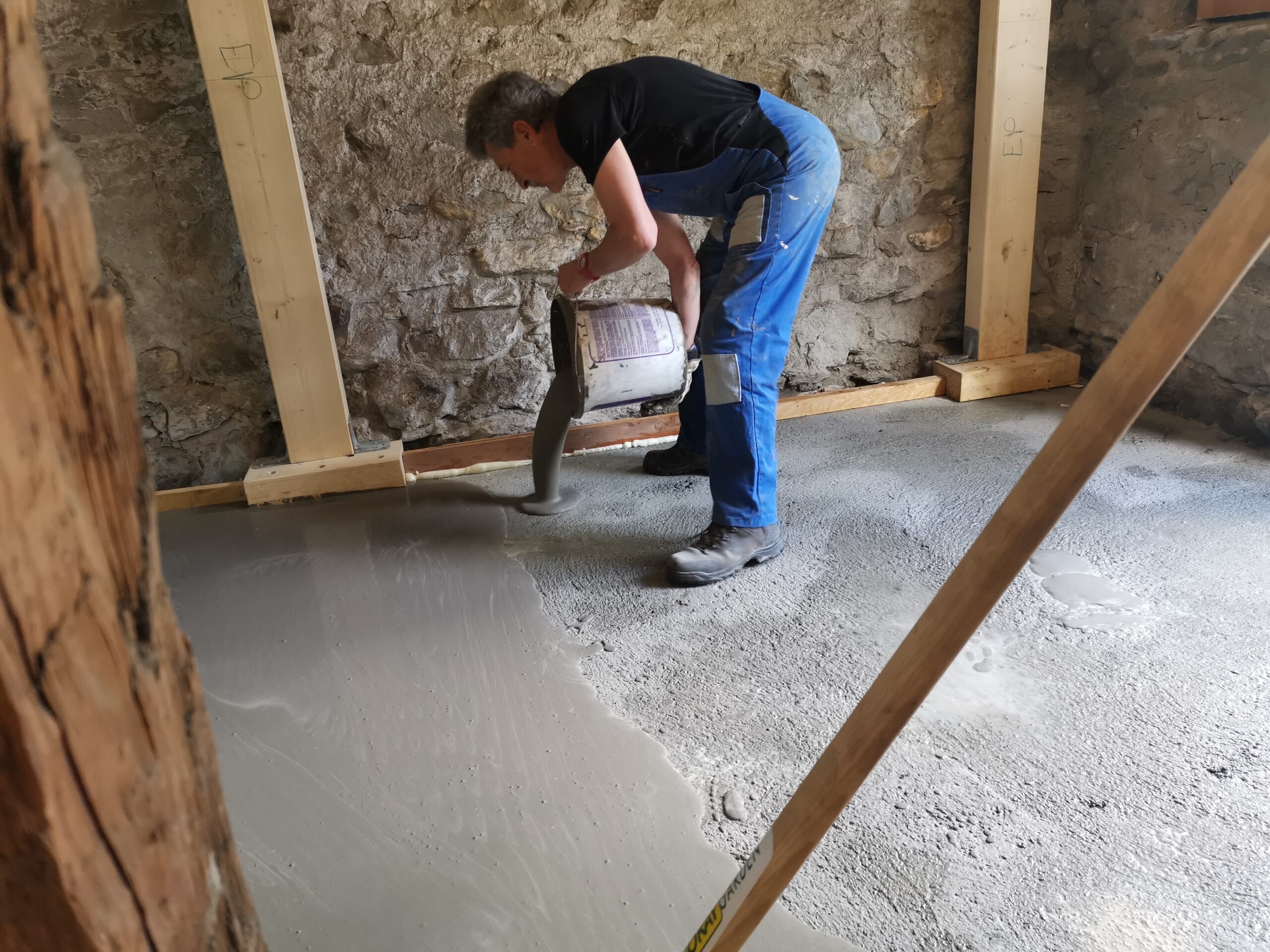 Der Betonboden ist für die Isolationsschicht nicht geeignet, es hat zu viele Höhendifferenzen. Deshalb habe ich den Boden mit SIKA-Floor Level 340 ausgegossen.